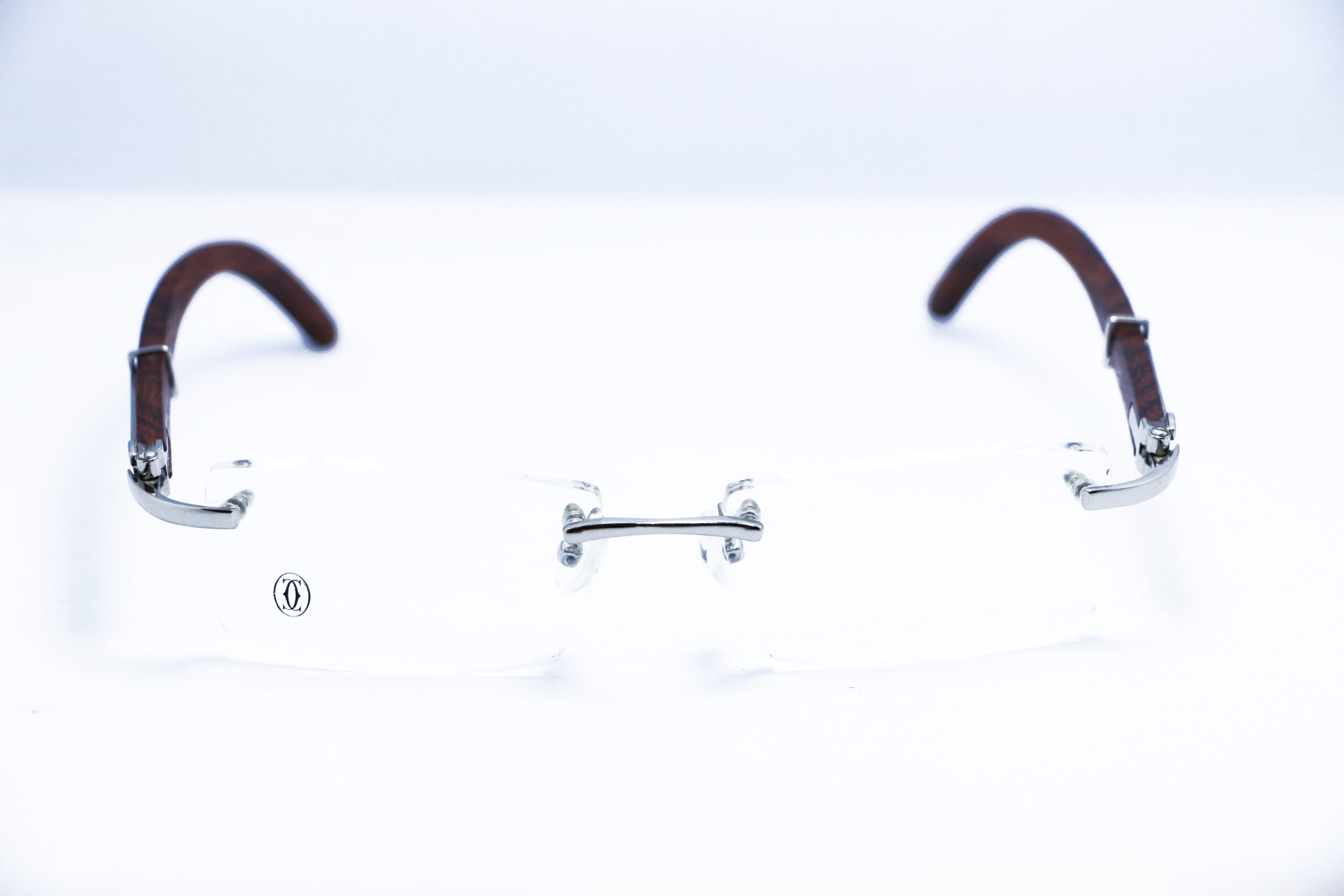 Elegant rimless eyeglasses with clear lenses, sleek metal details, and warm wooden temples—combining lightweight comfort with a refined, modern luxury look.